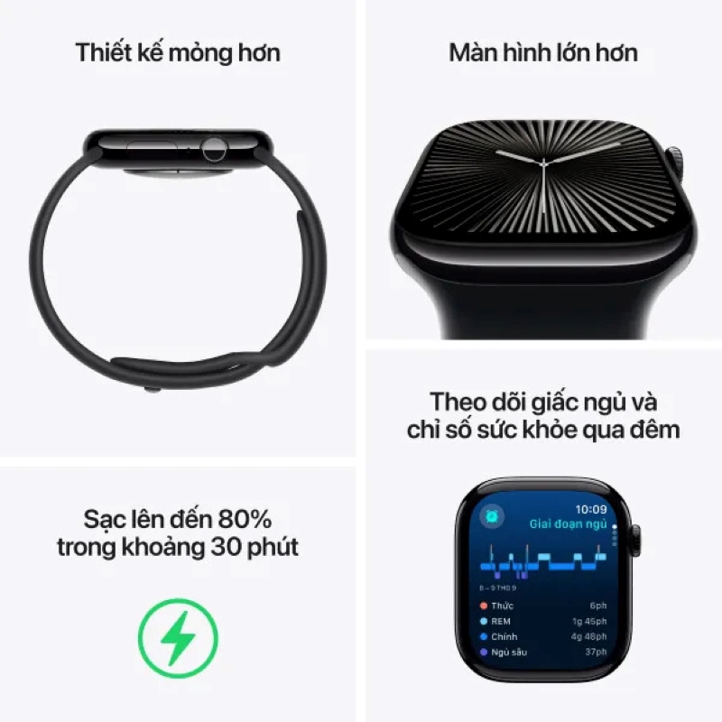 Với thiết kế mỏng nhẹ hơn, màn hình OLED sắc nét hơn, chip xử lý mạnh mẽ cùng các tính năng chăm sóc sức khỏe và hỗ trợ luyện tập toàn diện, Apple Watch Series 10 là sự lựa chọn lý tưởng cho người dùng yêu công nghệ, yêu thể thao và muốn kiểm soát tốt hơn cuộc sống của mình.