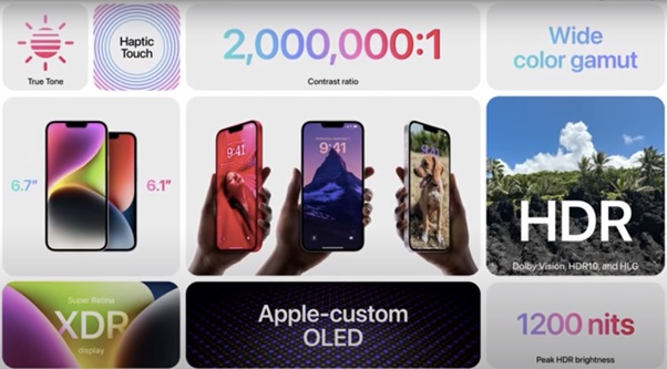 iPhone 14 được trang bị màn hình 6.1 inch Super Retina XDR OLED, độ phân giải 2532 x 1170 pixel ở mật độ điểm ảnh 460 ppi. Công nghệ Haptic Touch kết hợp lớp phủ oleophobic giúp cảm ứng nhạy và chống bám vân tay hiệu quả. Độ sáng tối đa lên đến 1200 nits, mang đến khả năng hiển thị rõ ràng ngay cả dưới ánh nắng mạnh.